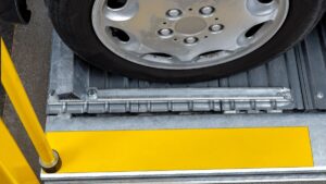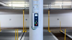 Platforme za parkiranje sa bočnim pomeranjem smanjuju površinu za vožnju u korist parking površina. Platforma se kreće po šinama ispred konvencionalnih parking mesta u 2 ili 3 reda. Jedan prazan prostor po redu omogućava pristup izabranom prostoru.